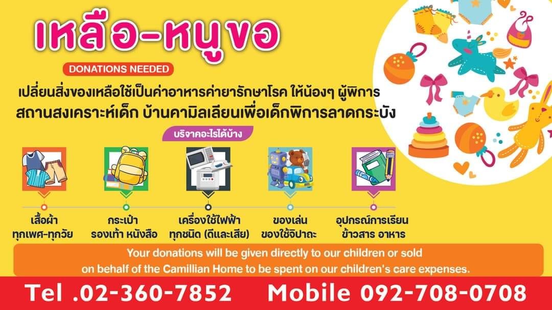 Camillian Home for Children with Disabilities Ladkrabang has implemented this project to ask for donations of leftover items that are no longer used by the donor but can still be used and in good condition, such as clothes, bags, shoes (all types, genders, ages), electrical appliances, general miscellaneous items. Choose for children with disabilities to take advantage of first. After that, the staff will make a screening. The rest will be used to make merit for interested people and low-income people in Punbun Shop.